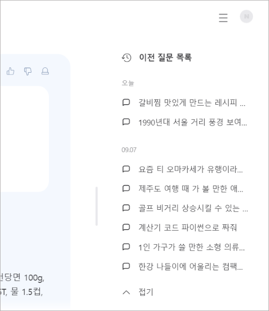 최대 2주 전까지의 이력을 확인할 수 있으며, 특정 이력이 화면에 노출되지 않길 원하는 경우 마우스 오버 시 노출되는 제외 버튼을 통해 개별 질문을 목록에서 제외할 수 있습니다.